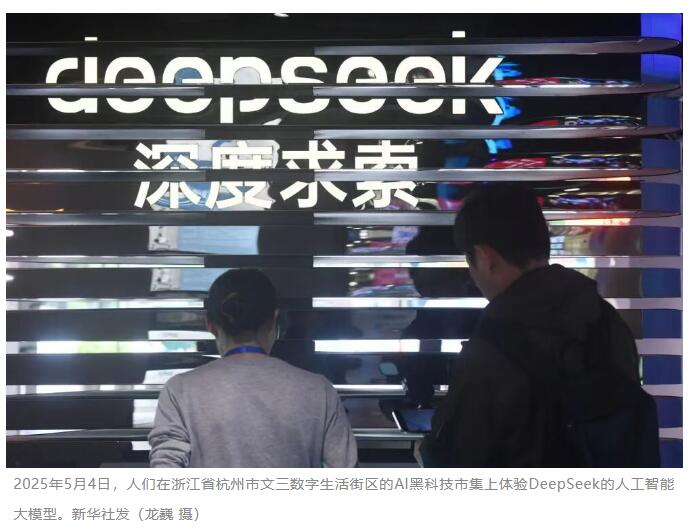 2025年5月4日,人们在浙江省杭州市文三数字生活街区的AI黑科技市集上体验DeepSeek的人工智能大模型。新华社发(龙巍 摄)