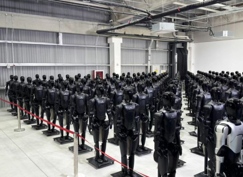 (智元机器人在工厂量产下线,列队整装待发。杨让晨/摄影)
