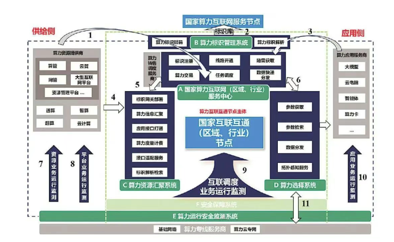 在统一标准方面,依托国家算力互联网(区域、行业)服务中心、算力标识管理系统、算力资源汇聚系统、算力选择系统、算力运行安全监测系统、算力安全保障系统六大核心系统,实现算力资源接口的标准化适配。其中,算力资源汇聚系统通过统一协议对接通算、智算、超算等异构算力资源;算力选择系统构建统一参数信息库,实现不同算力资源的性能、成本等指标横向对比,保障跨节点数据高效传输与调度。